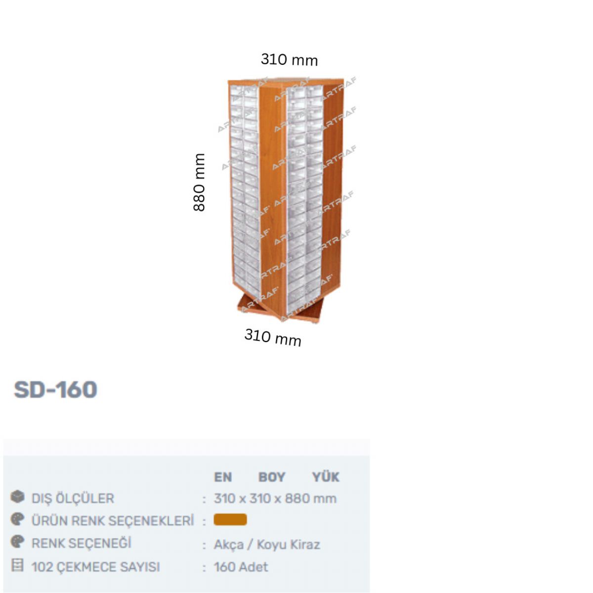 Teknik Özellikleri 160 Plastik çekmeceli kutulu, dört yönlü dönen suntalam gövdeli dolap Dış Ölçüleri: 310*310*880 mm 102 Çekmece 160 Adet Renk: Akça / Koyu Kiraz