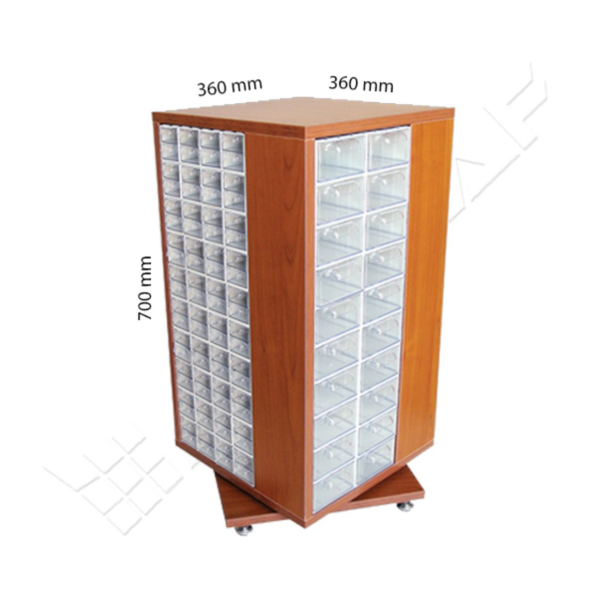 Teknik Özellikleri 220 Plastik çekmeceli kutulu, dört yönlü dönen suntalam gövdeli dolap Dış Ölçüleri: 360*360*700 mm 305 Çekmece 160 Adet 301 Çekmece 40 Adet 302 Çekmece 20 Adet Renk: Akça / Koyu Kiraz
